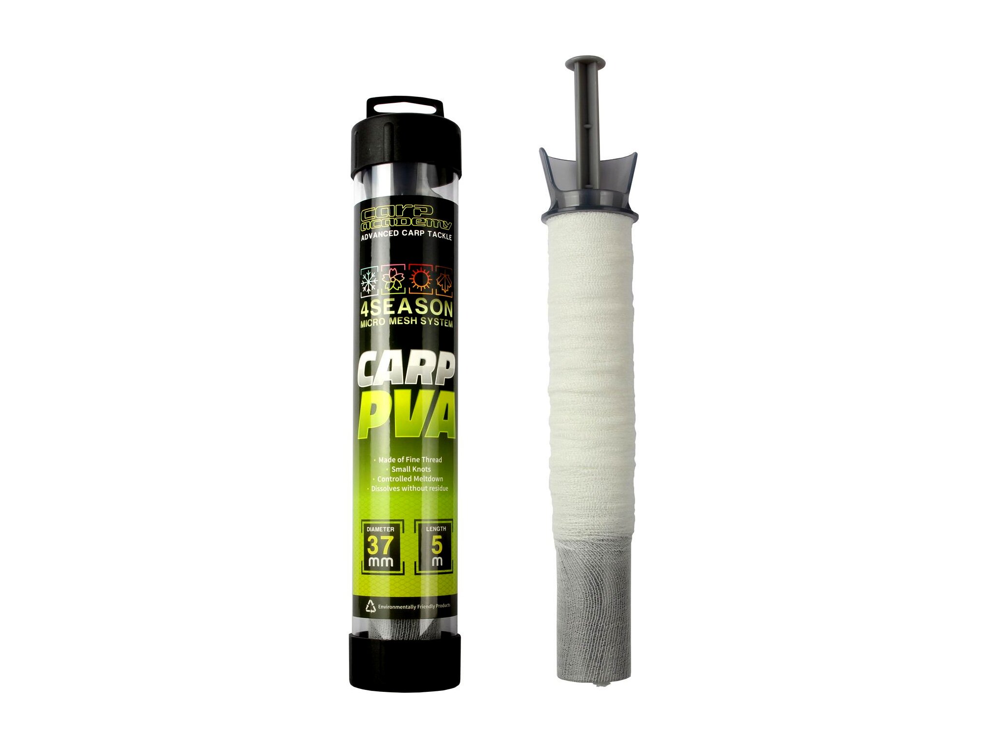 Prémium minőségű, vékony PVA szálból, micro átmérőjű lyukbőséggel van szőve, ezért hideg és meleg vízben is egyaránt könnyen oldódik. Ennek ellenére rendkívül erős, ezért nem szakad töltés és dobás közben. Extra sűrű szövése miatt tört bojlikkal, keményebb magvakkal és method mixxel is könnyedén hasznáható.