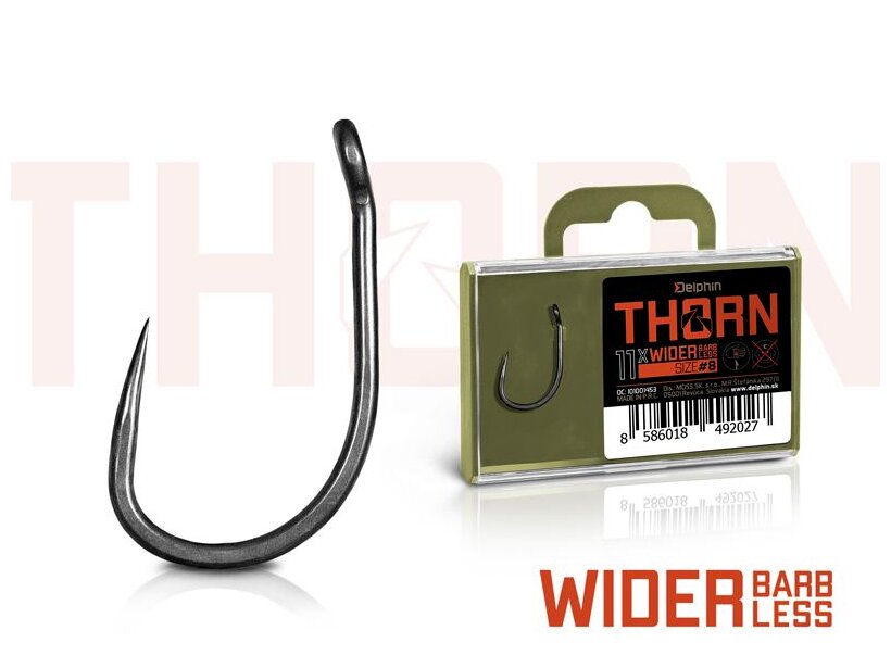 A Delphin THORN egy prémium kategóriájú pontyozóhorog a legmagasabb minőségben. A gyártásban alkalmazott modern technológiáknak köszönhetően ezek a horgok egyet jelentenek a kompromisszumok nélküli szilárdsággal és a maximális élességgel. A THORN sorozat horgai titanX felületkezeléssel rendelkeznek, ami matt szürke felületet eredményez nekik, amely szintén tökéletesen sima a ponty szájába való könnyű behatolás érdekében. A TitanX gondoskodik az egész horog megerősítéséről és tartósságáról is.