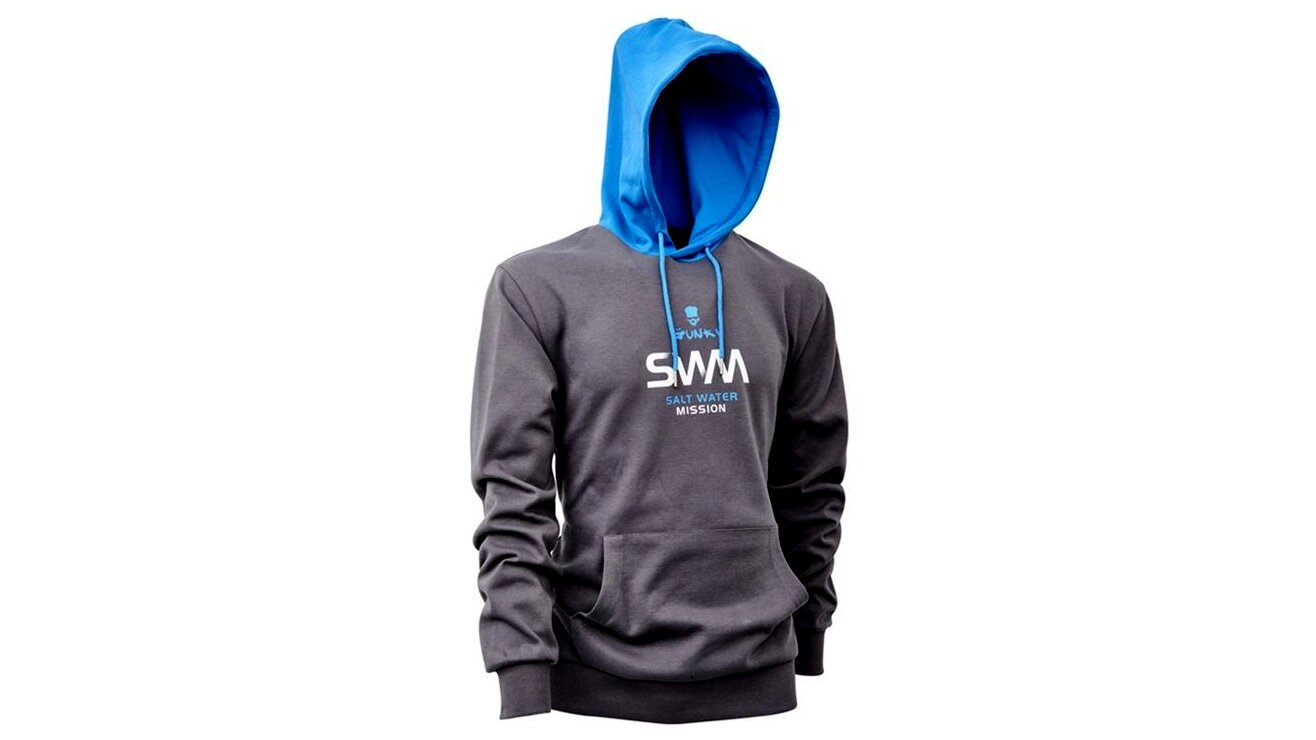 A GUNKI kapucnis, SWM logós pulóver nagyon kényelmes szabást kínál, amely horgászat közben nem korlátozza a mozgást. Tágas kenguruzseb található rajta. Összetétel: 60% pamut, 40% poliészter, súly: 280 g/m2.