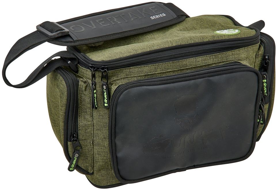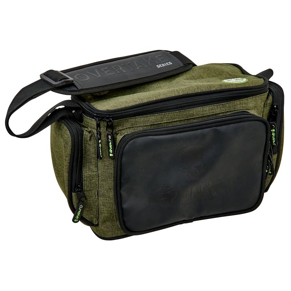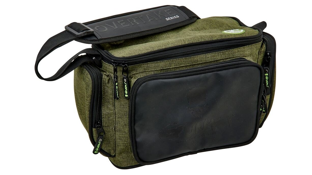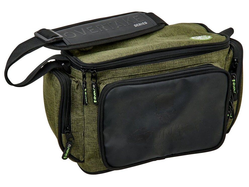 Egy táska, amiben mindent tárolhatsz, amire a pergetéshez szükséged van. Tartalmaz egy nagy, cipzáras fő rekeszt, három kisebb, cipzáras külső zsebet és egy állítható, párnázott vállpántot. Az erős, tartós anyagot kiváló minőségű cipzárak egészítik ki. Mindez Gunki dizájnban. Tartalmaz még két csalidobozt is, amelyek mérete 27,5x19,5x4,5 cm. A táska méretei: 29x13x21 cm.