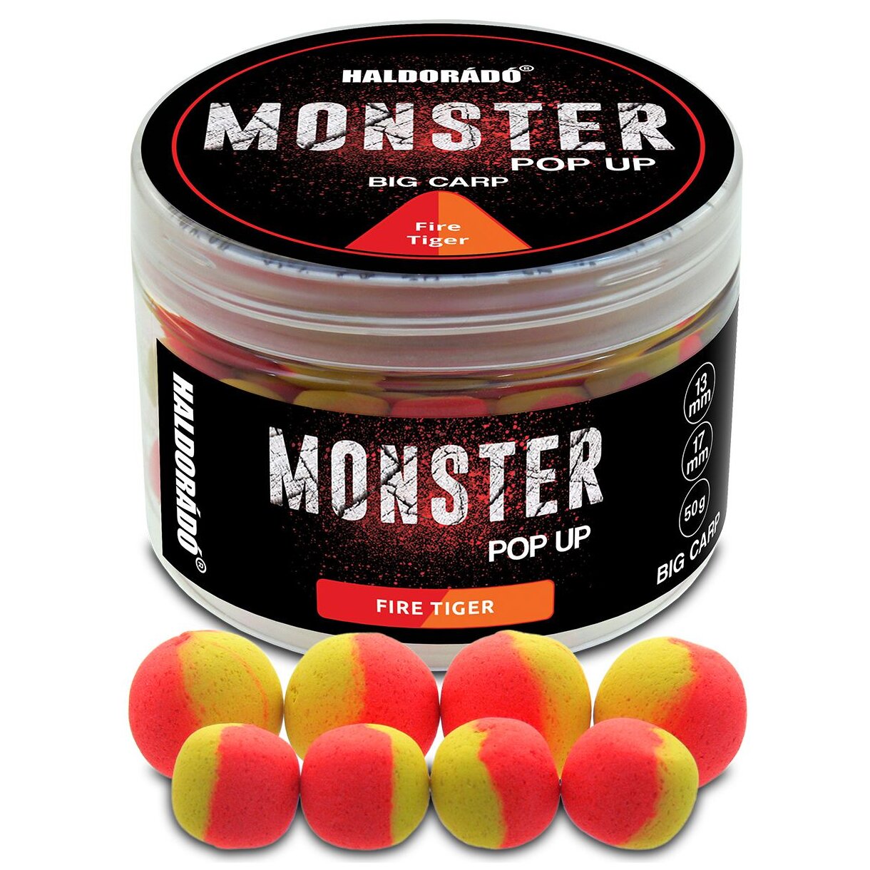A MONSTER Pop Up Big Carp tégelyében 13 és 17 mm-es változatok találhatók meg. A golyóknak nemcsak ízük, de színük is kevert, így feltűnők a sötétebb színű aljzaton, vagy pelletes bojlis etetésen is.