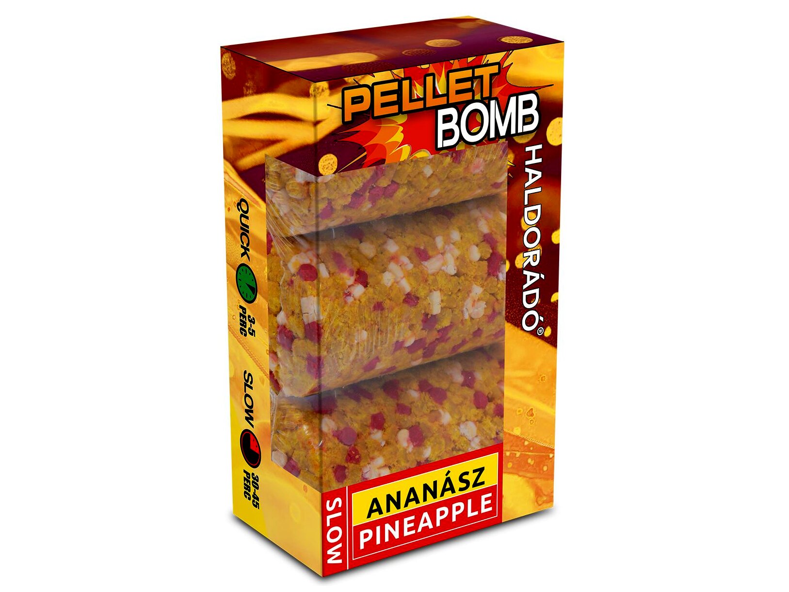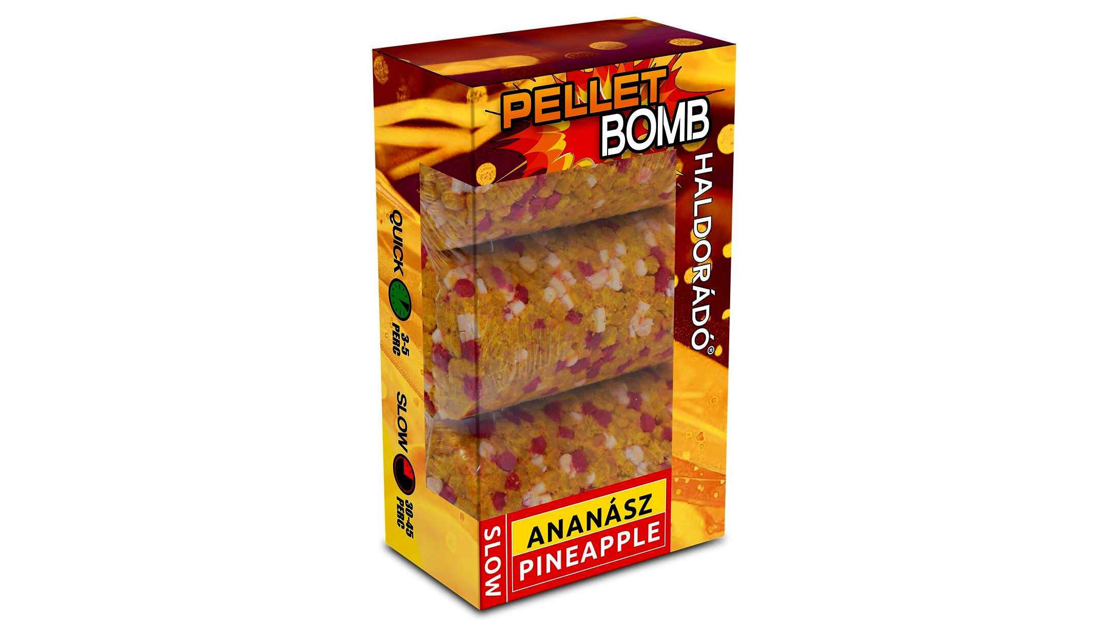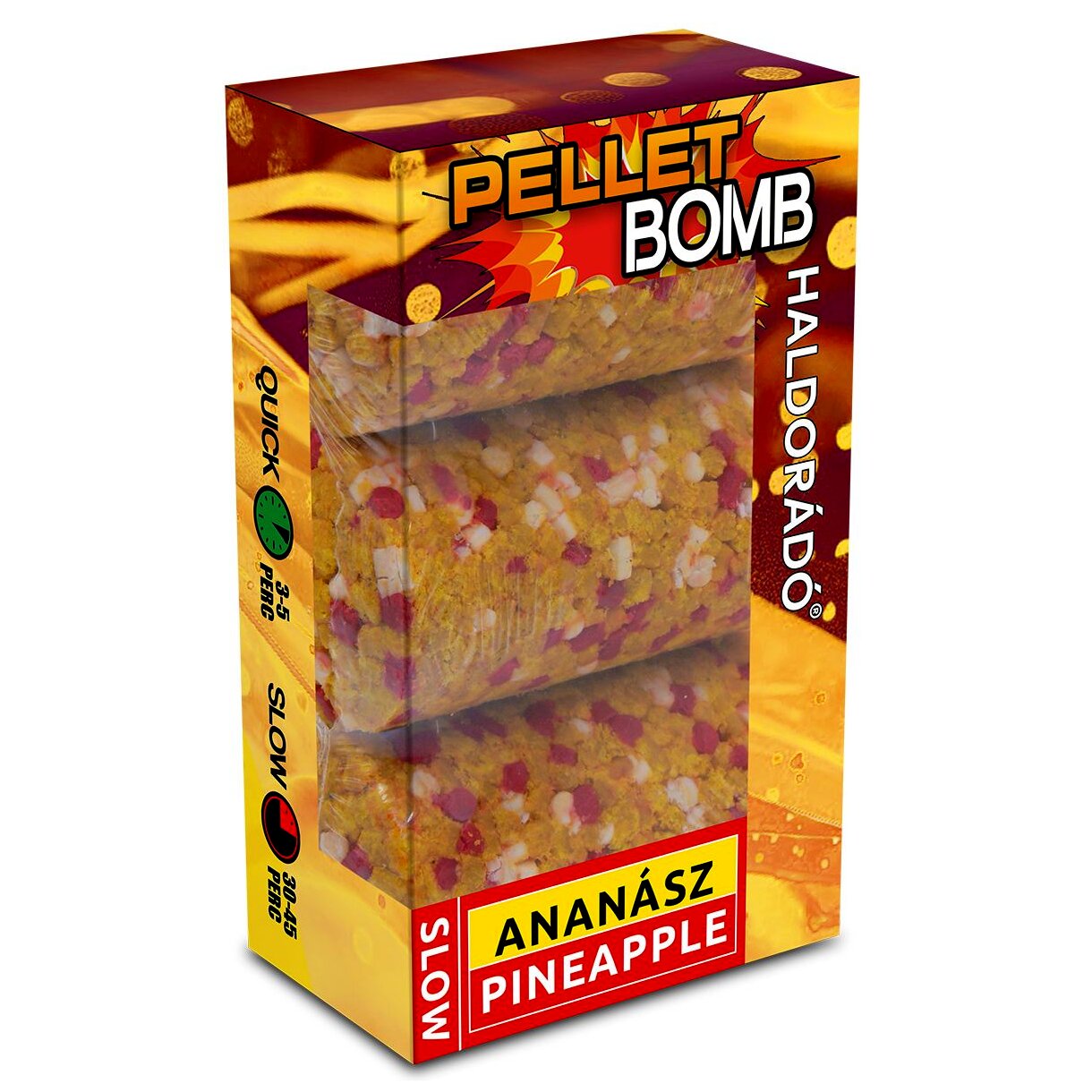 A Pellet Bomb egy nagy nyomással préselt csalogatóanyag, mely alapanyagául a legfogósabb pelletek szolgálnak. A henger alakú, középen lyukas tabletta könnyen felhelyezhető a Pellet Bomb Casting Rocket ra. Ennek köszönhetően mindössze 1-2 perc, és máris bevethető a fogós végszerelék!