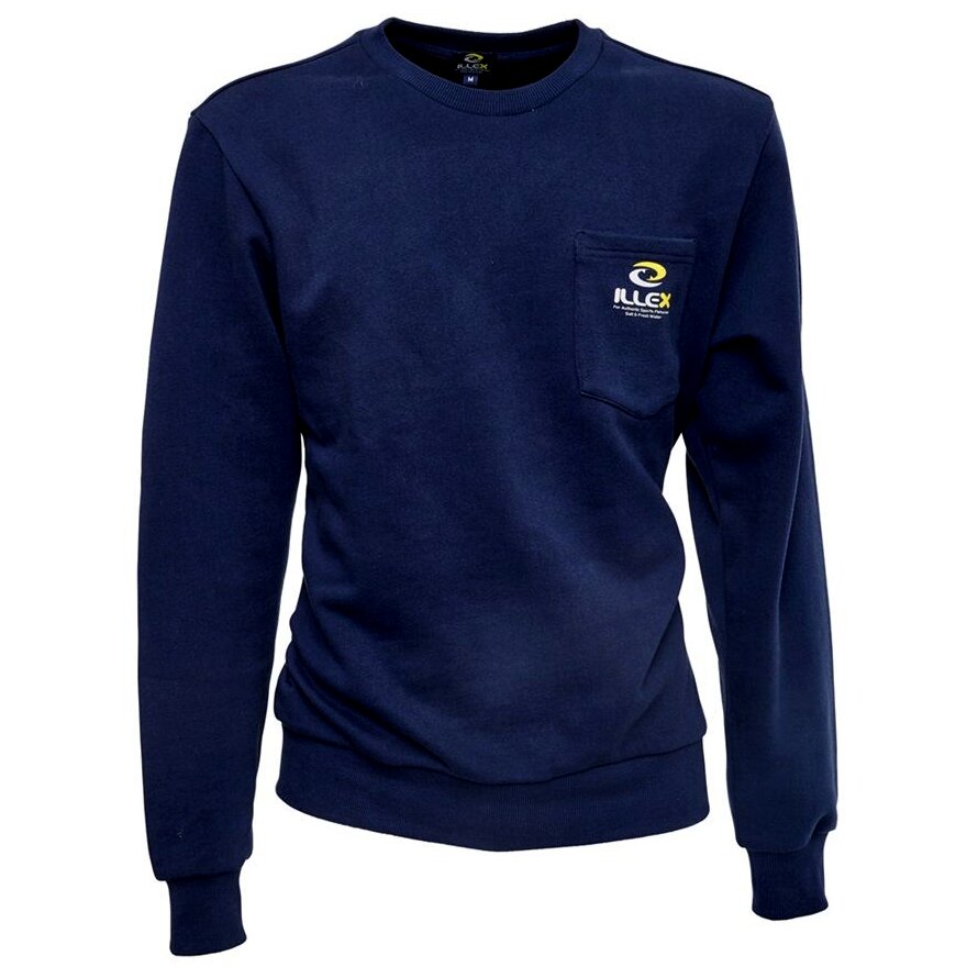 ILLEX sötétkék pulóver kerek nyakkivágással. Stílusos logós nyomtatás a mellzsebben és a bal ujjon. Kényelmes szabás mindennapi viseletre. Összetétel: 52% pamut, 48% poliészter, súly: 310 g/m2.