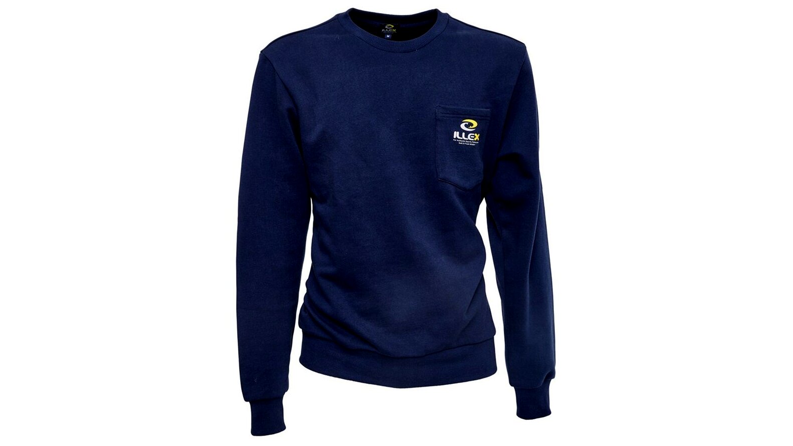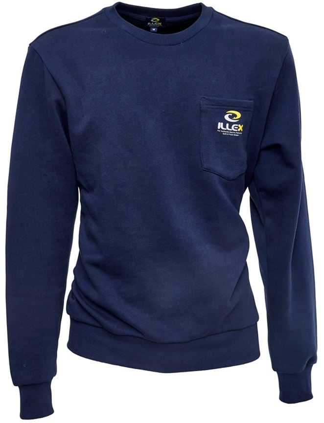 ILLEX sötétkék pulóver kerek nyakkivágással. Stílusos logós nyomtatás a mellzsebben és a bal ujjon. Kényelmes szabás mindennapi viseletre. Összetétel: 52% pamut, 48% poliészter, súly: 310 g/m2.
