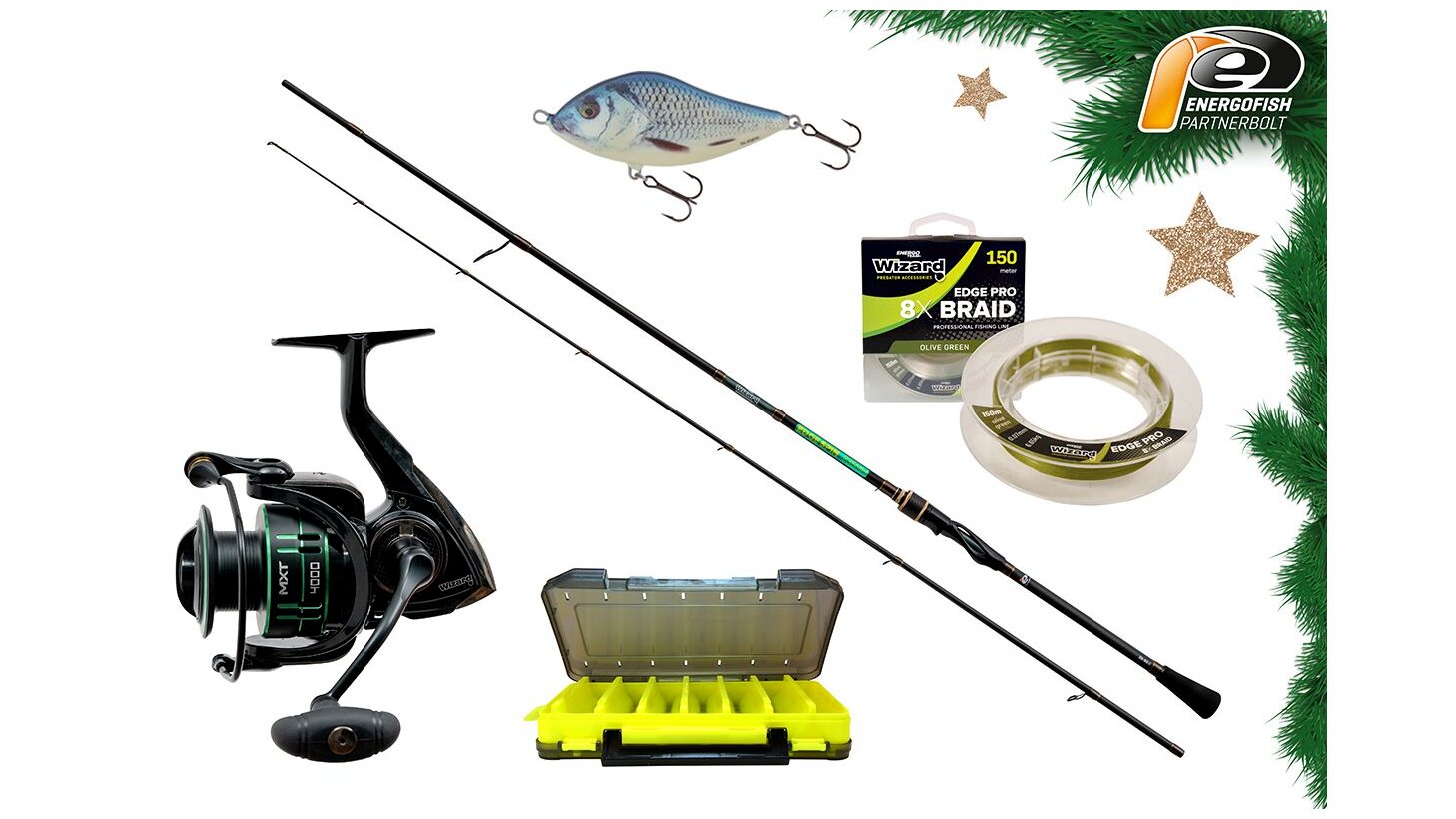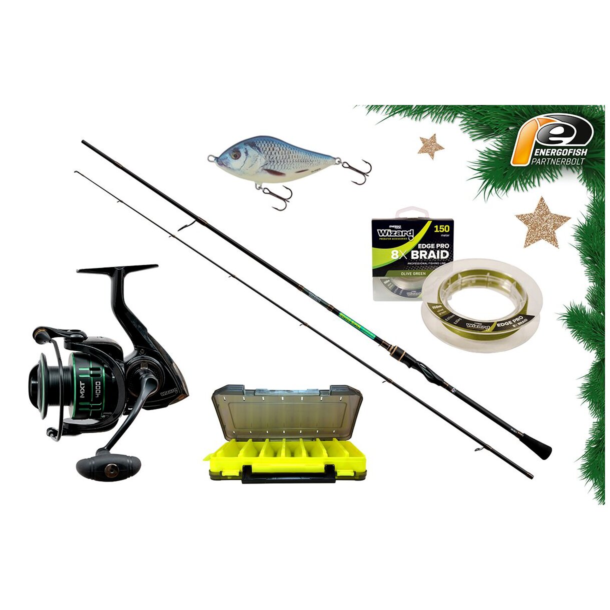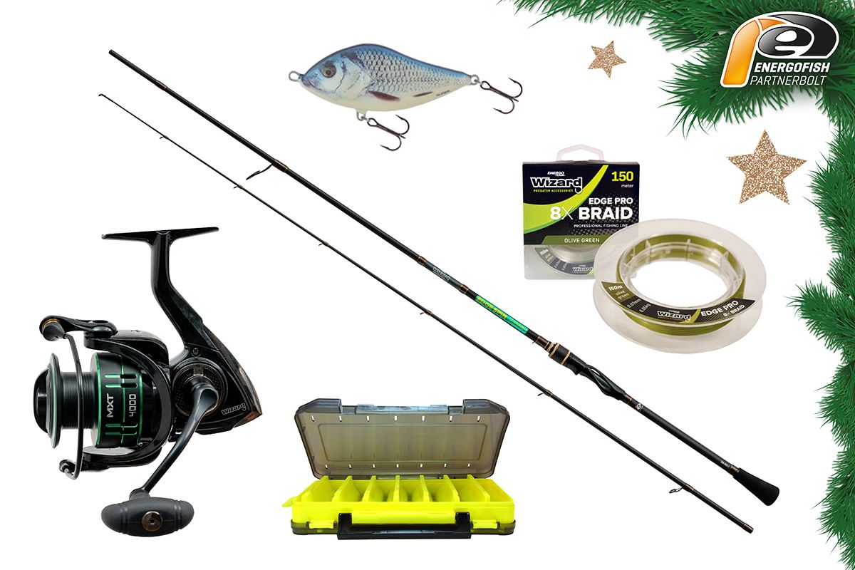 A Karácsonyi Wizard Edge Szett 2,15 m 25-55 g egy prémium minőségű, kompromisszummentes pergető összeállítás, amely kiváló választás süllőre, csukára és harcsára horgászóknak. A szett alapja a gyors és feszes Wizard Edge pergető bot, melyet a megbízható Wizard MXT 4000 orsó egészít ki. A csomag tartalmaz egy praktikus műcsalis dobozt, erős 8x fonott Wizard Edge Pro zsinórt, valamint egy közkedvelt Salmo Slider wobbler csalit is. Kompakt, azonnal használható szett, amely tökéletes ajándék minden pergető horgász számára!