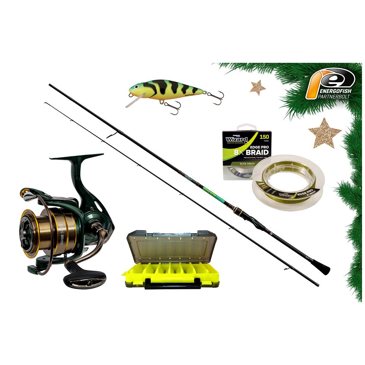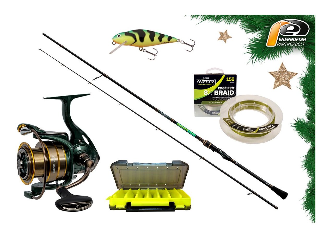 A Karácsonyi Wizard Edge Szett 2,15 m 45-95 g egy prémium minőségű, kompromisszummentes pergető összeállítás, amely kiváló választás nagyobb csukára és harcsára horgászóknak. A szett alapja a gyors és feszes Wizard Edge pergető bot, melyet a megbízható Wizard Edge 5000 orsó egészít ki. A csomag tartalmaz egy praktikus műcsalis dobozt, erős 8x fonott Wizard Edge Pro zsinórt, valamint egy közkedvelt Salmo Perch wobbler csalit is. Kompakt, azonnal használható szett, amely tökéletes ajándék minden pergető horgász számára!