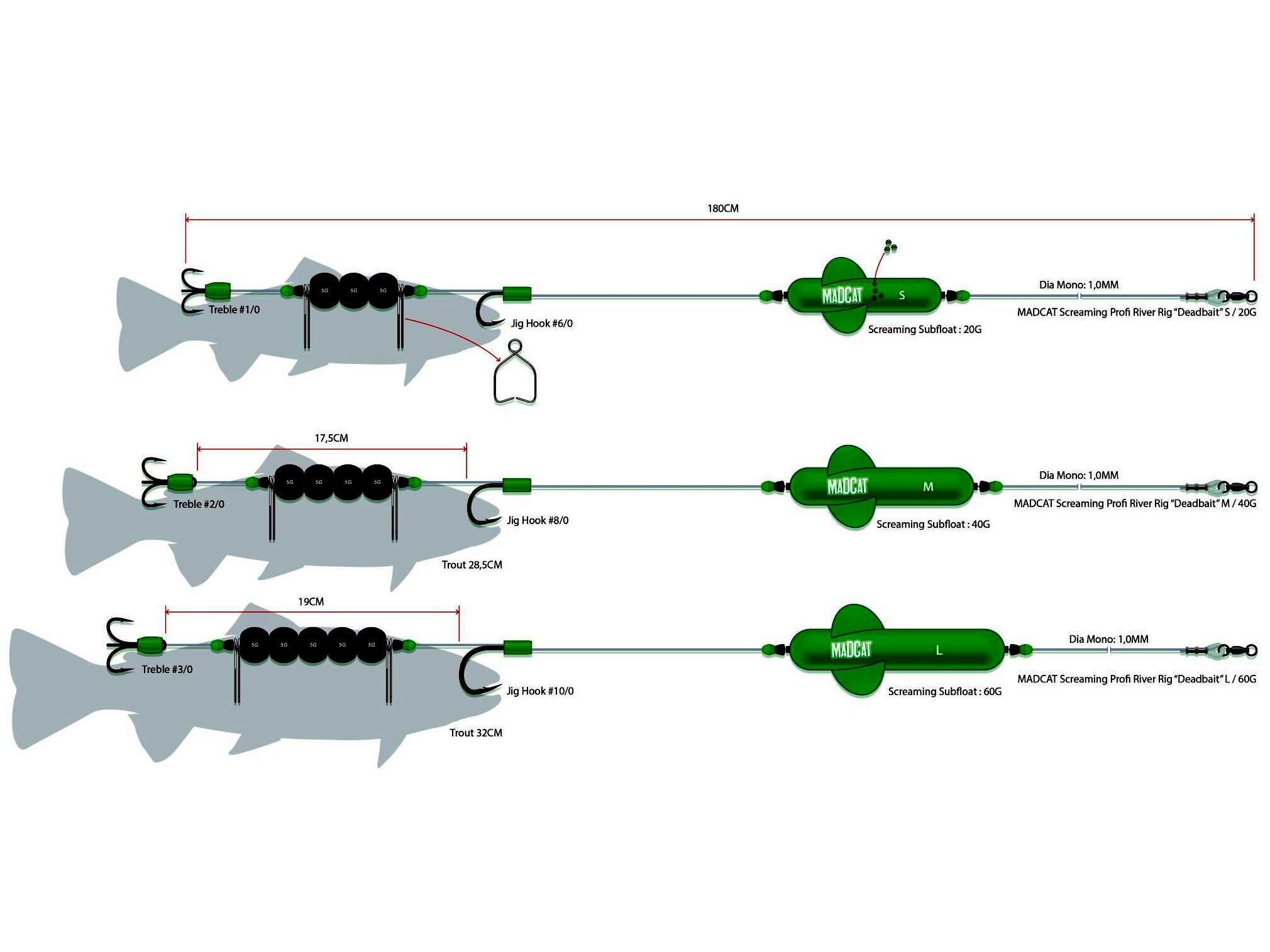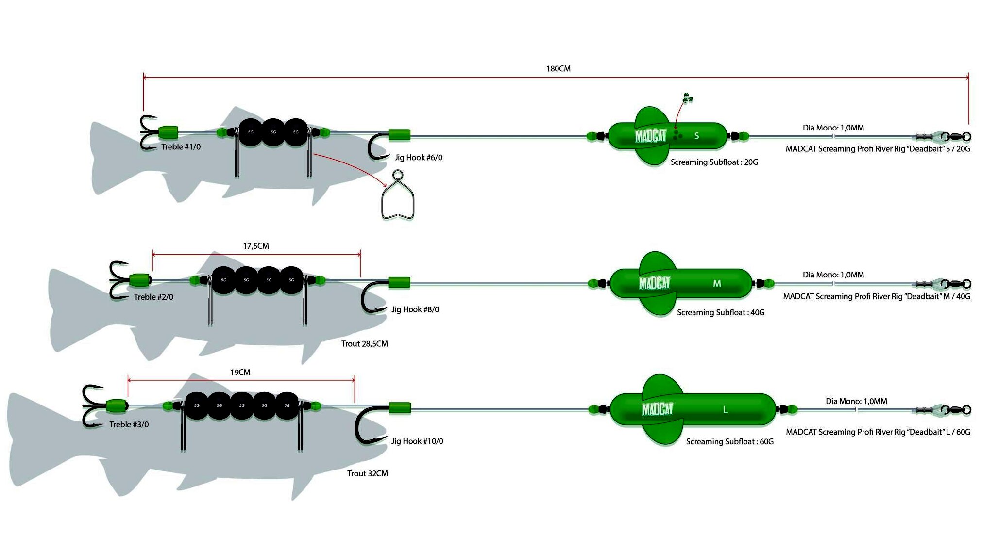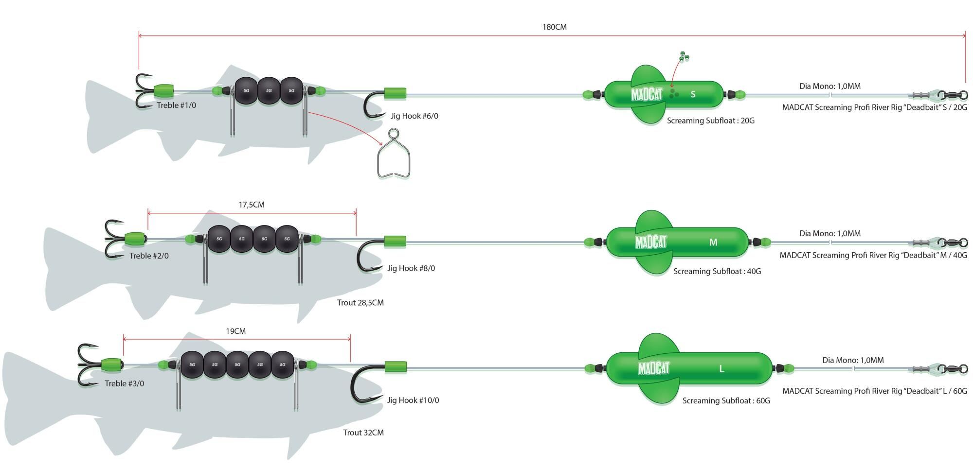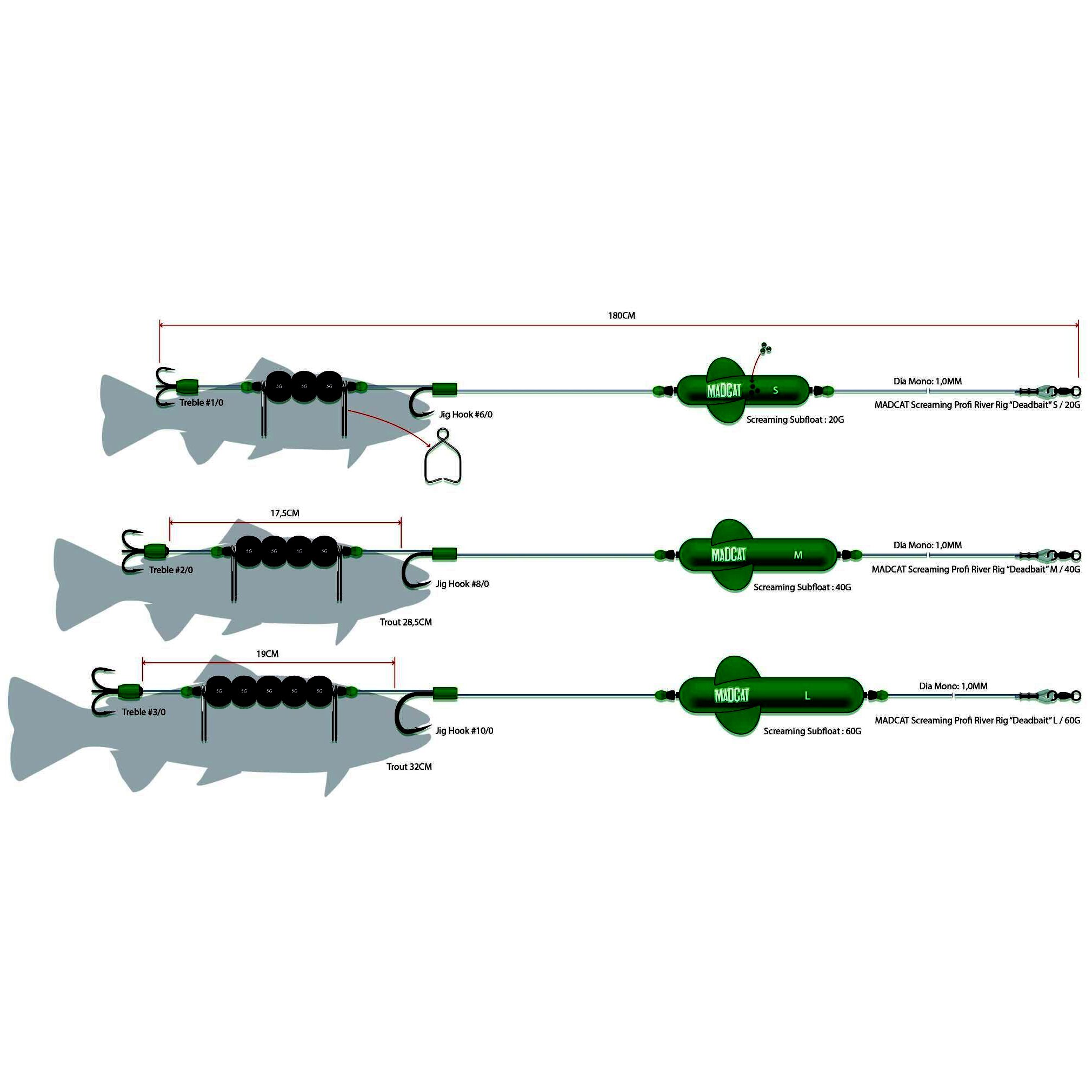 A MADCAT® Screaming Subfloat búvárúszóval készített szerelék, gyors folyású folyókon, élettelen csalihallal való fenekezéshez. 1.00mm vastagságú MADCAT® Ultra-soft Mono Leader zsinórból kötve. Teljes hossz: 180cm. Három változatban kapható: S, M és L (ideális csalihal méretek: 25, 28,5 és 32cm). Szakítószilárdság: 45kg.
