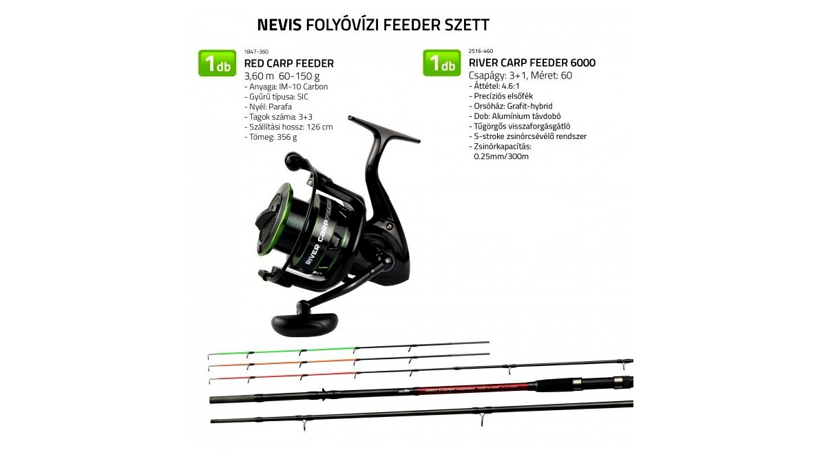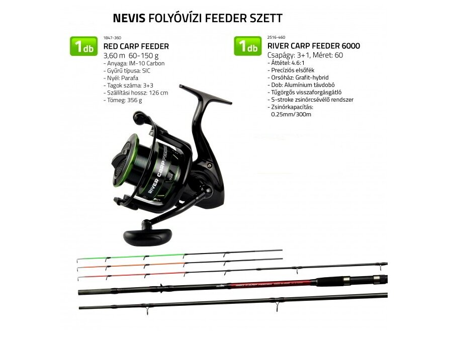 A Nevis Folyóvízi feeder szett egy komplett, azonnal használatra kész felszerelés, amelyet kifejezetten folyóvízi feeder módszerhez állítottak össze. A csomag tartalma bot és orsó, így ideális választás kezdőknek és haladóknak egyaránt. A komponensek úgy vannak összeválogatva, hogy erősebb sodrásban is jól működjenek, és lehetővé tegyék a nagyobb kosarak pontos bedobását, valamint a közepes és nagyobb méretű halak biztonságos fárasztását.