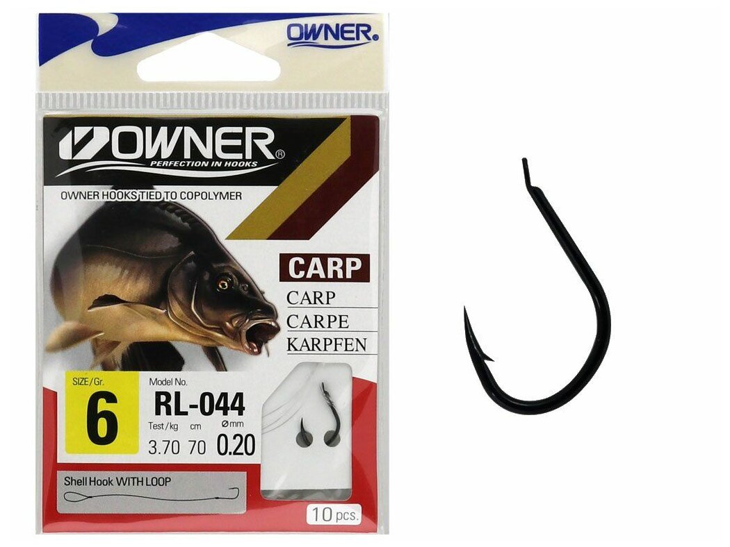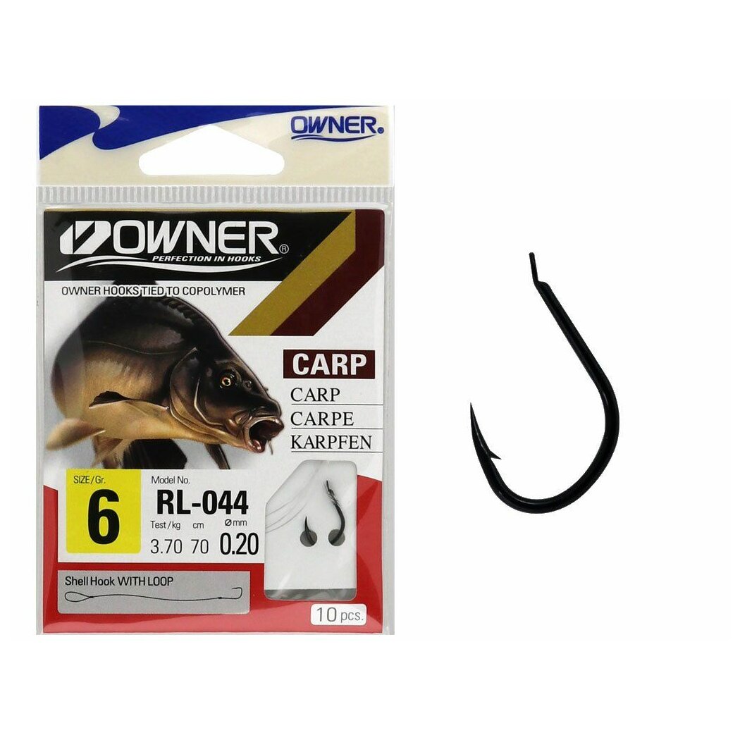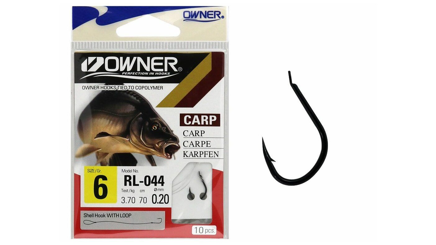 Owner RL-044 Előkötött horgok. Owner 50044 Isema RV fekete színű, lapkás horog, klasszikus pontyozó forma.