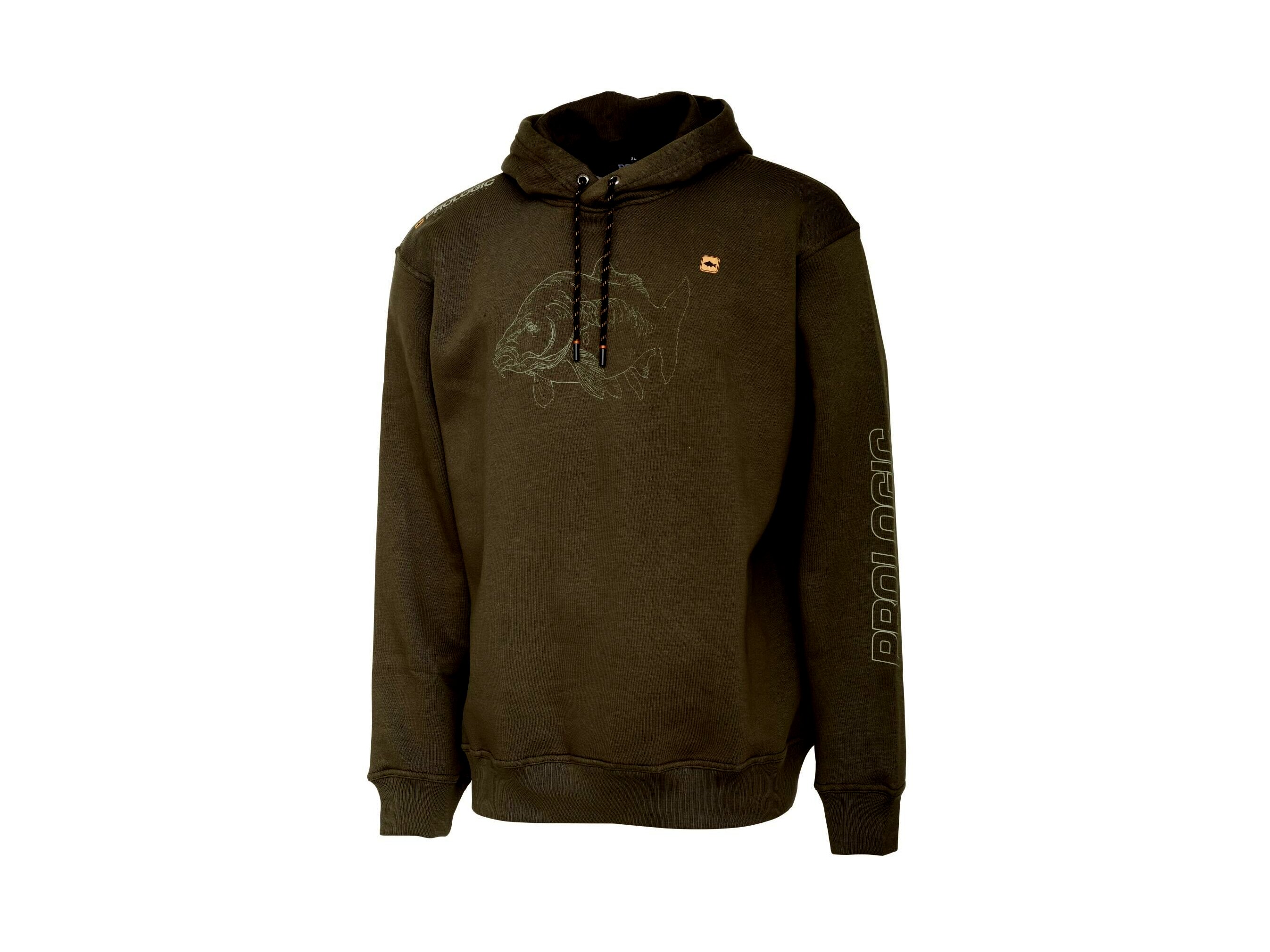 kombinációjából készült kapucnis pulóver előlapján egy ikonikus tükörponty látható, a karján és mellkasán pedig a Prologic logója.