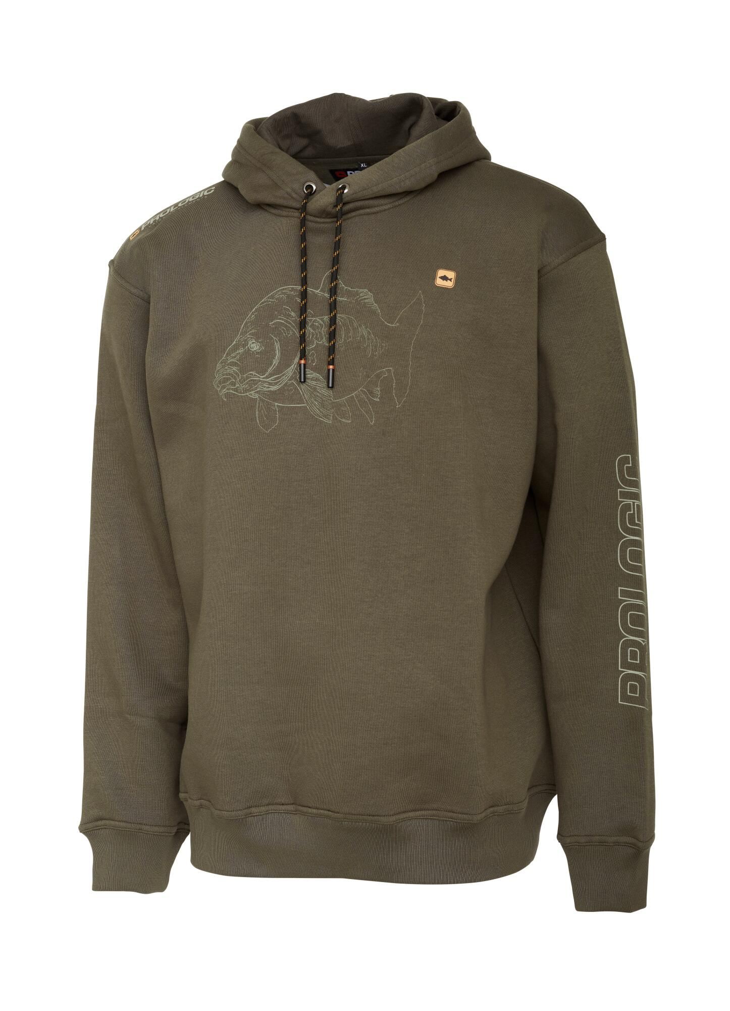 kombinációjából készült kapucnis pulóver előlapján egy ikonikus tükörponty látható, a karján és mellkasán pedig a Prologic logója.