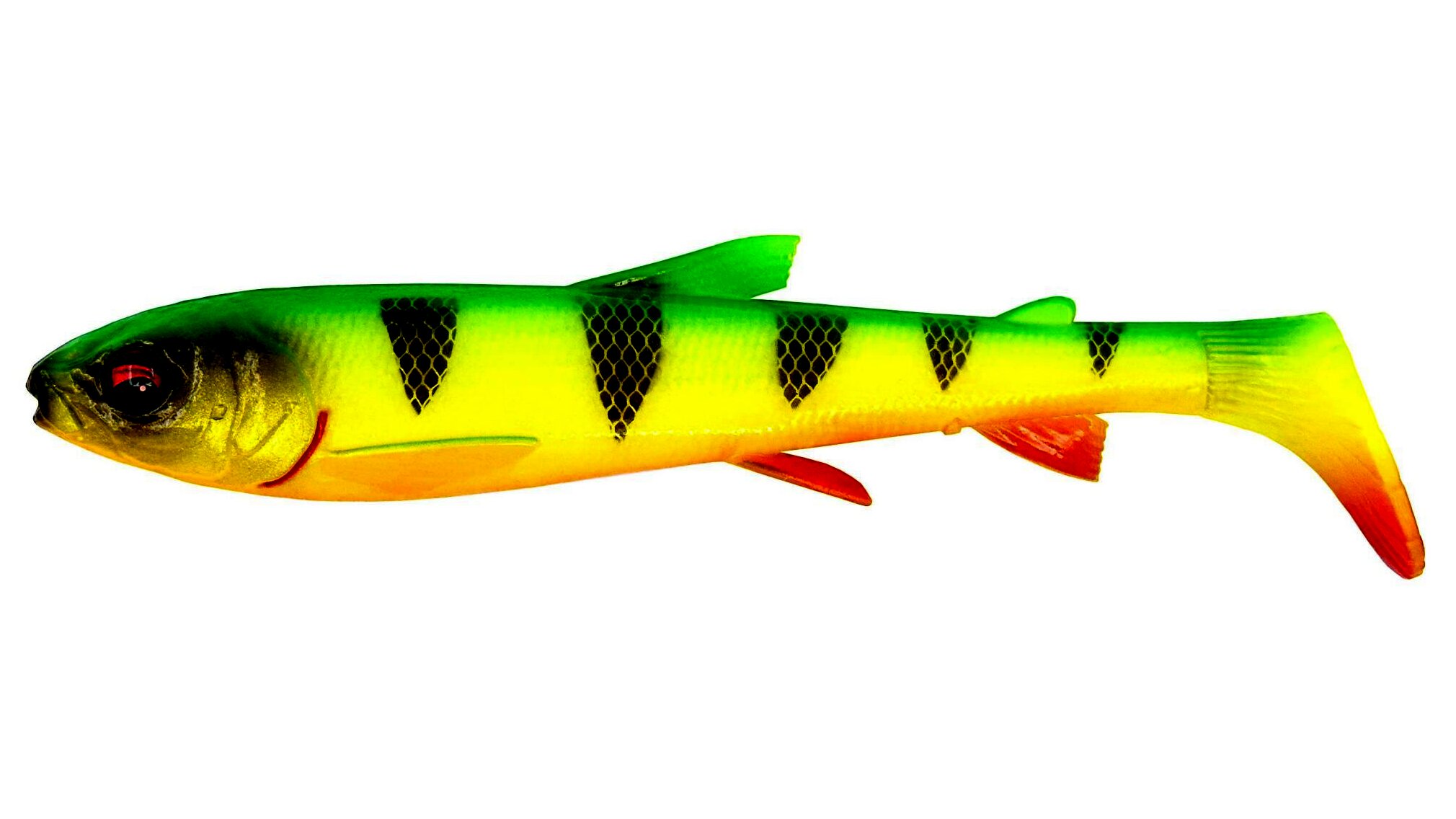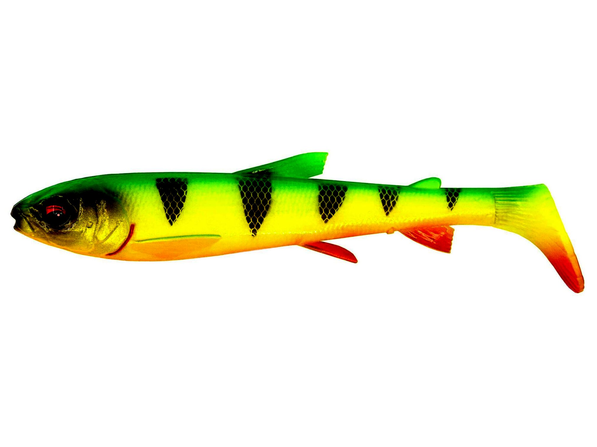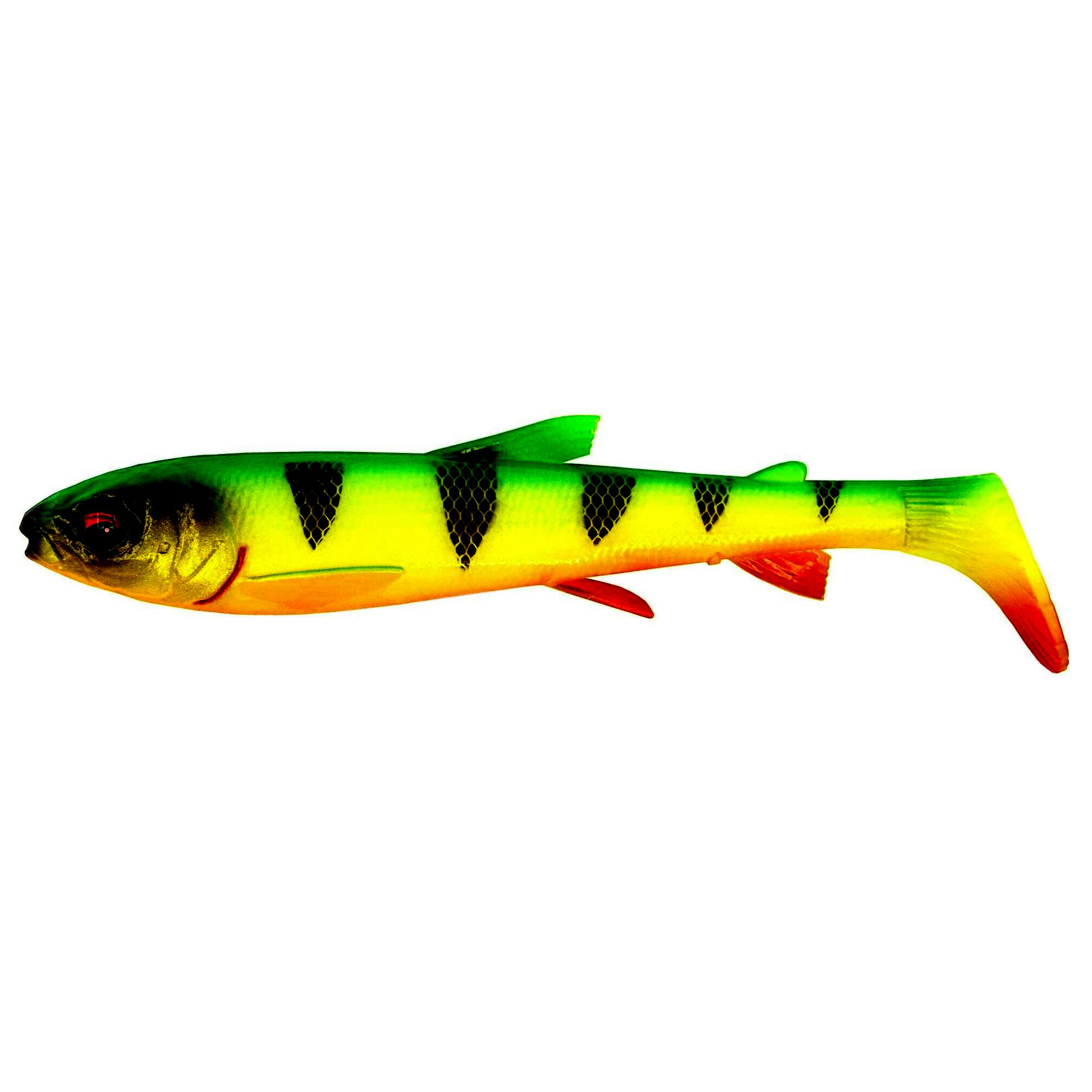 Egy valós fehérhal szkennelése alapján készült ez a laza testű pálcafarok műcsali, amely kifinomult részletekkel és fantasztikus gördülő és rúgó mozgással rendelkezik. A dundi fej és az első testrész sok vizet lövell, ezáltal nagy stabilitást biztosít a sekély szerelés során. Az ízületes és szuperrealisztikus uszonyok remek másodlagos mozgást adnak a nagy pálcafarok rúgásához, amelyben zajos üveg zörgő is található a plusz vonzerő érdekében. Szuperpuha PVC anyagból készült, lenyűgöző színekkel és csábító illattal.