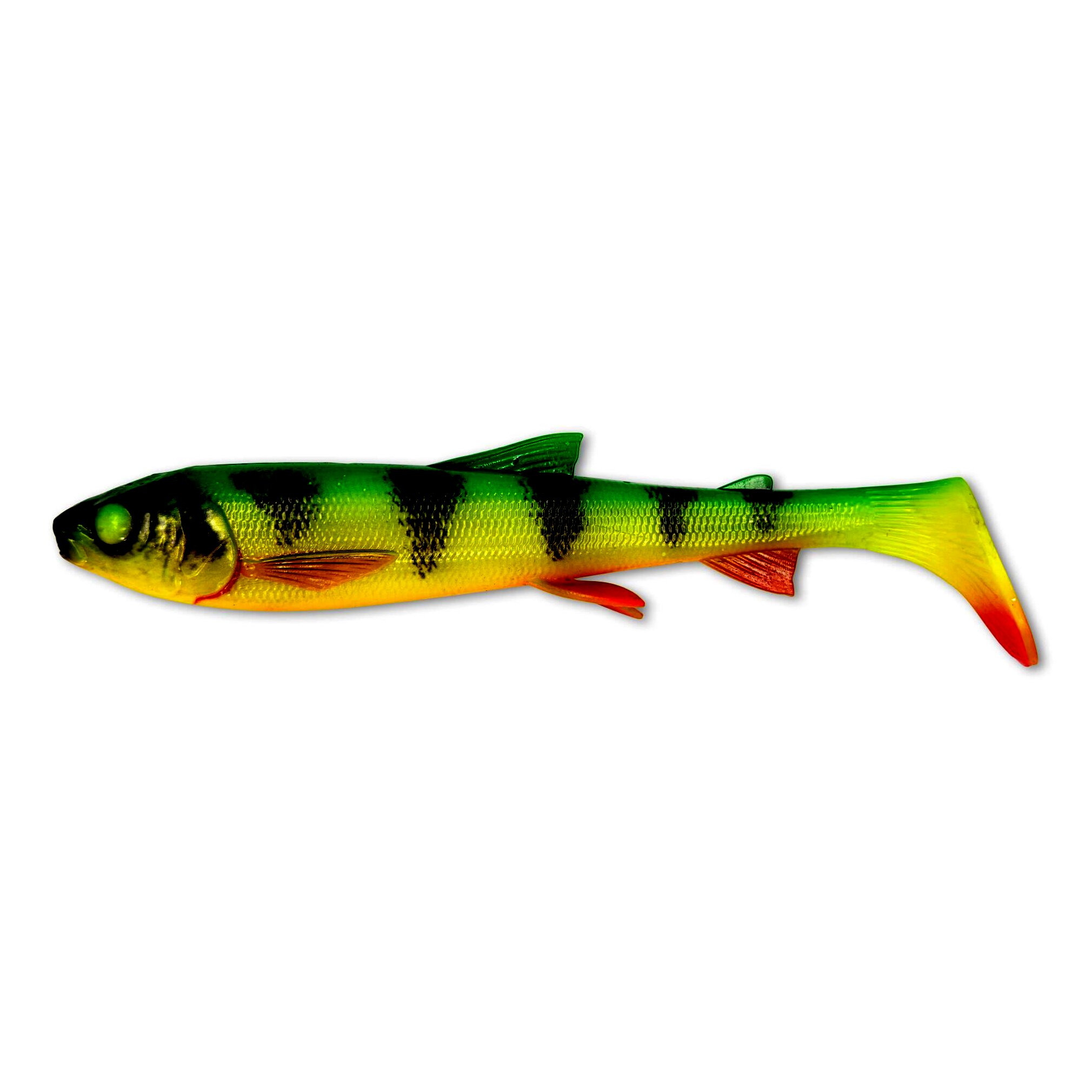 Egy valós fehérhal szkennelése alapján készült ez a laza testű pálcafarok műcsali, amely kifinomult részletekkel és fantasztikus gördülő és rúgó mozgással rendelkezik. A dundi fej és az első testrész sok vizet lövell, ezáltal nagy stabilitást biztosít a sekély szerelés során. Az ízületes és szuperrealisztikus uszonyok remek másodlagos mozgást adnak a nagy pálcafarok rúgásához, amelyben zajos üveg zörgő is található a plusz vonzerő érdekében. Szuperpuha PVC anyagból készült, lenyűgöző színekkel és csábító illattal.