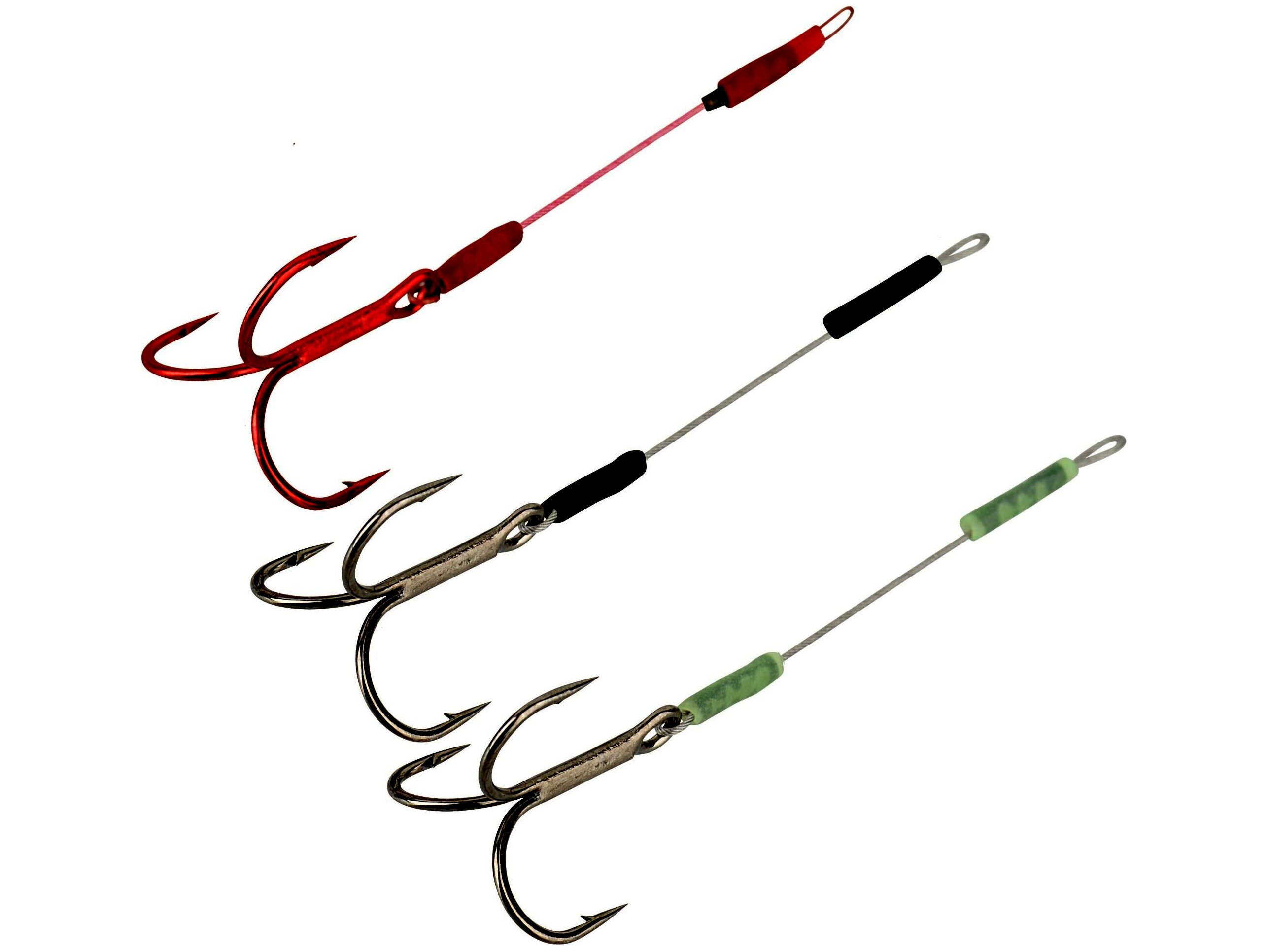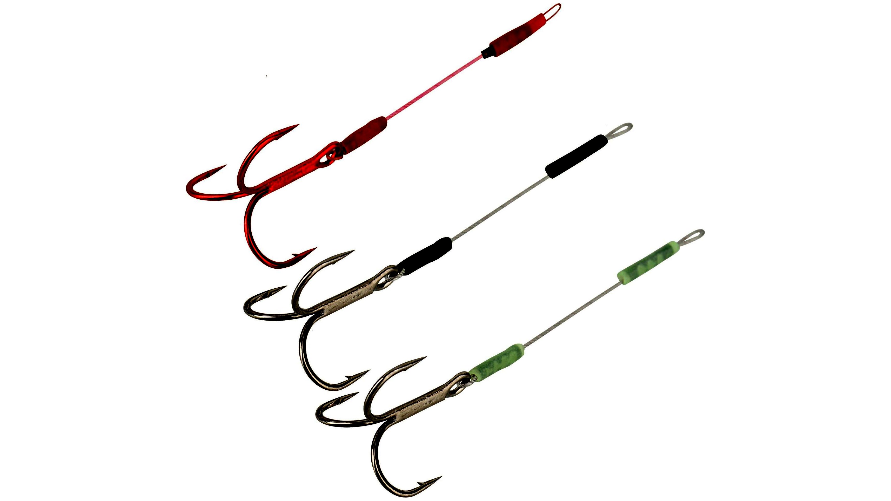 Egy hármashorgos patkoló előkék SGY 1X-Treble hármashorgokkal, tökéletesen krimpelve a bevonatos Carbon49 előkedrótra. 2 db füstszürke és 1 db vérpiros előke egy csomagban. Minden fülhöz egyegy szilikon csövecskét szereltek, hogy az előkét rögzíteni lehessen a jigfej fülén.