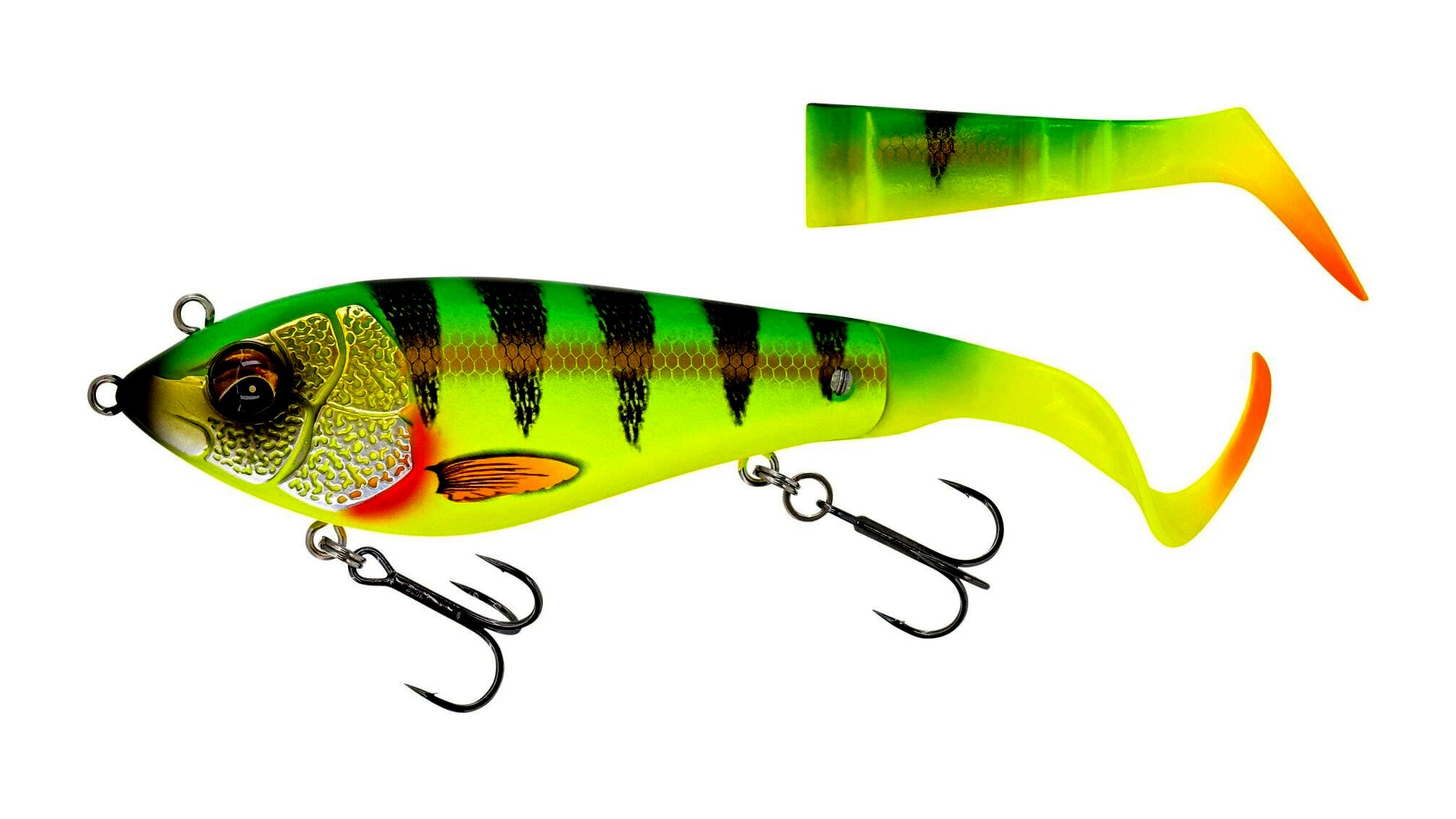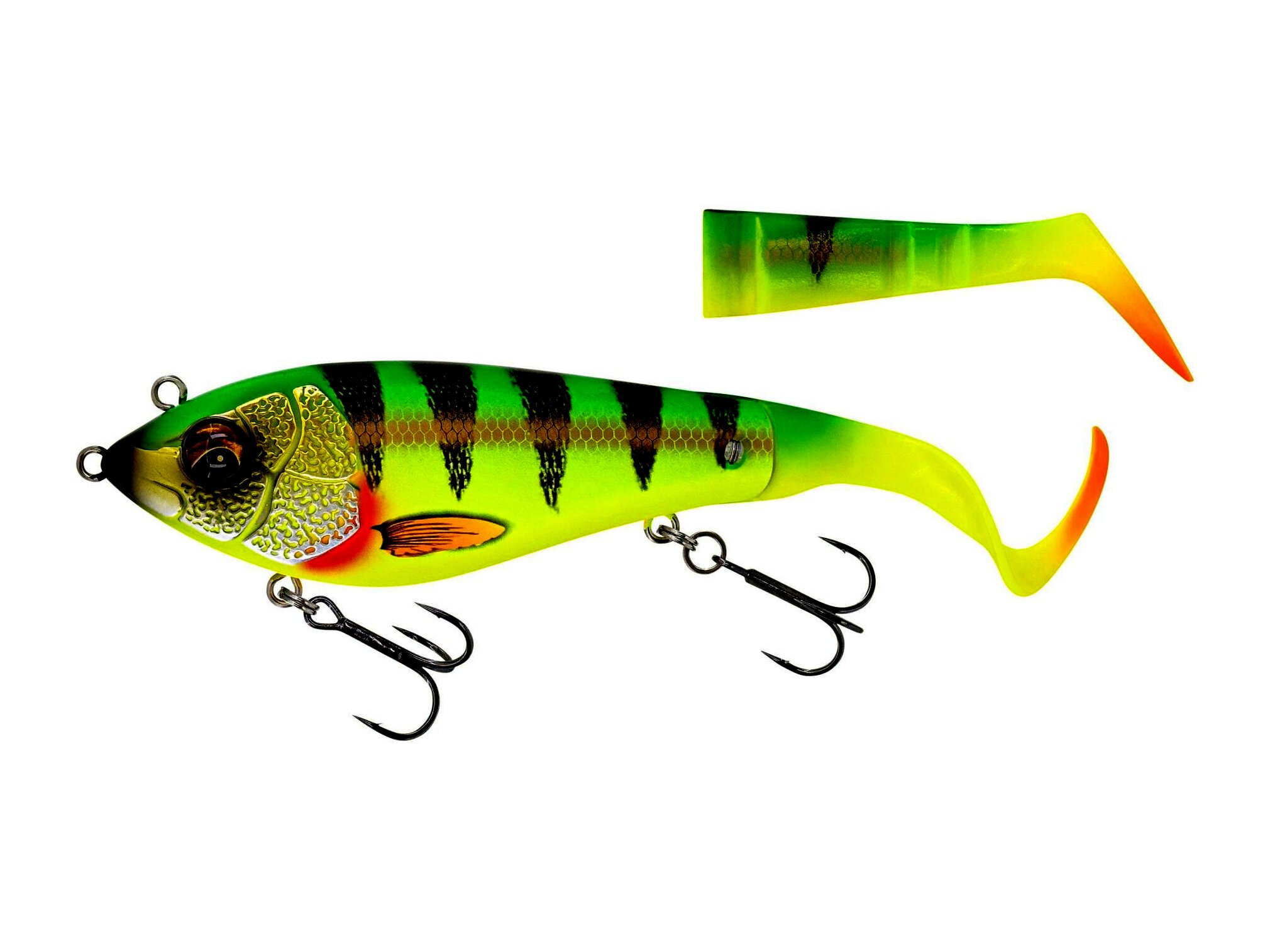 Egy nagyszerű hibrid műcsali, amely rendkívül élénk és pörgős mozgással rendelkezik: a pálcafarokkal frenetikus rúgás és a mini hullámos farokkal őrült sikló mozgás. A két kötőpont lehetővé teszi a műcsali munkálását a sekély víztől közepes mélységig. A Unique Cross jaw lock farok rendszer tökéletes helyzetben tartja a farokrészeket, és lehetővé teszi a farokgyors és biztos cseréjét vagy a farokirány változtatását. Így a műcsalit farok felfelé vagy lefelé is horgászhatod, teljesen más munkamélységet és mozgási mintát hozva létre. Összességében egy rendkívül sokoldalú farok csali - hosszú dobásteljesítménnyel, ami kiváló kereső csali! Pont úgy, mint a Deviator Swim, ez a klasszikus csuka csali lesz!